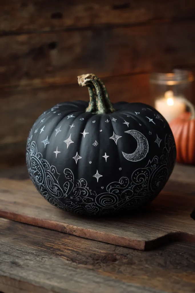 Painted in matte black, this pumpkin is decorated with silver moons, stars, and swirling celestial details. The intricate patterns create the look of a magical night sky, glowing even more against the rustic wood backdrop and soft candlelight nearby. The dark base makes the silvery accents shimmer as if they were twinkling.