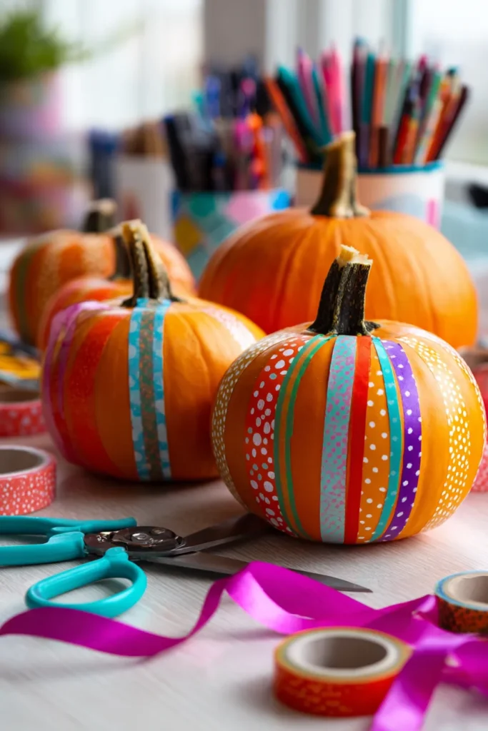 These pumpkins are wrapped in strips of colorful washi tape, each one patterned with dots, stripes, or bright geometric designs. The vibrant colors pop against the orange skin, and the mix of textures makes them feel playful and fun. Scattered craft supplies in the background highlight the creative process behind them.