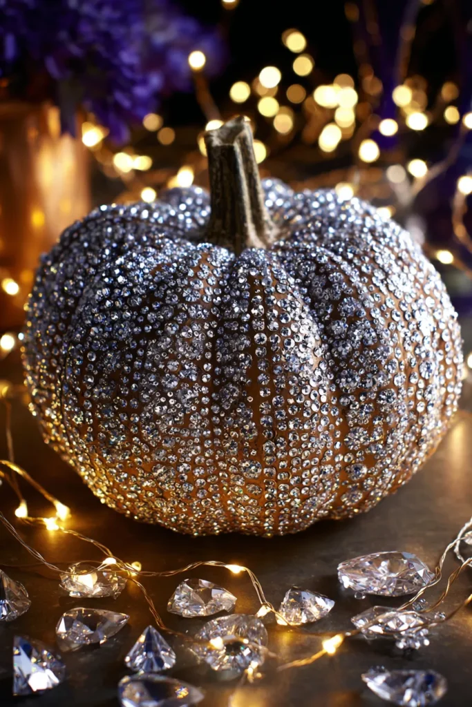 This pumpkin is covered from top to bottom with sparkling rhinestones, arranged in neat, shimmering rows. The light bounces off every surface, making it feel like a dazzling jewel among cozy fairy lights and faux crystals. It gives off a glamorous vibe that’s hard to miss.