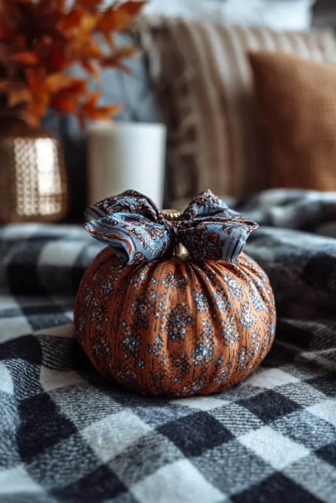This pumpkin is wrapped in a patterned fabric, tied at the top with a large bow for a soft, cozy finish. The fabric’s autumn-inspired colors pair beautifully with the plaid blanket it rests on, creating a layered, textured look that feels warm and inviting.