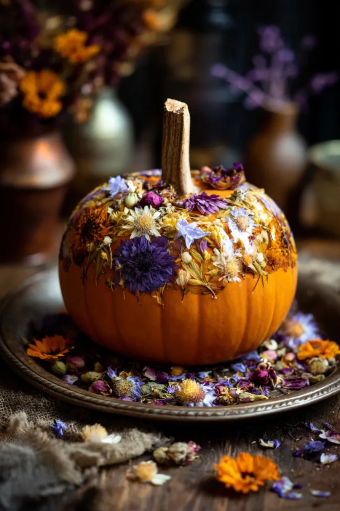 This pumpkin is decorated with dried flowers in shades of purple, yellow, and cream, carefully arranged to create a natural, romantic design. The petals and textures give it a soft, cottage-style look, especially with more dried flowers scattered around its base on a rustic tray.