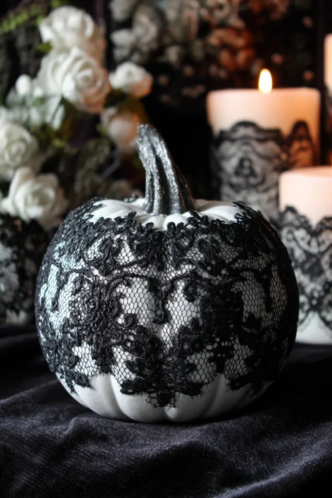 A white pumpkin is wrapped in elegant black lace, creating a dramatic high-contrast design. The lace detail gives it a gothic yet sophisticated vibe, surrounded by black candles and white roses for an extra moody touch.