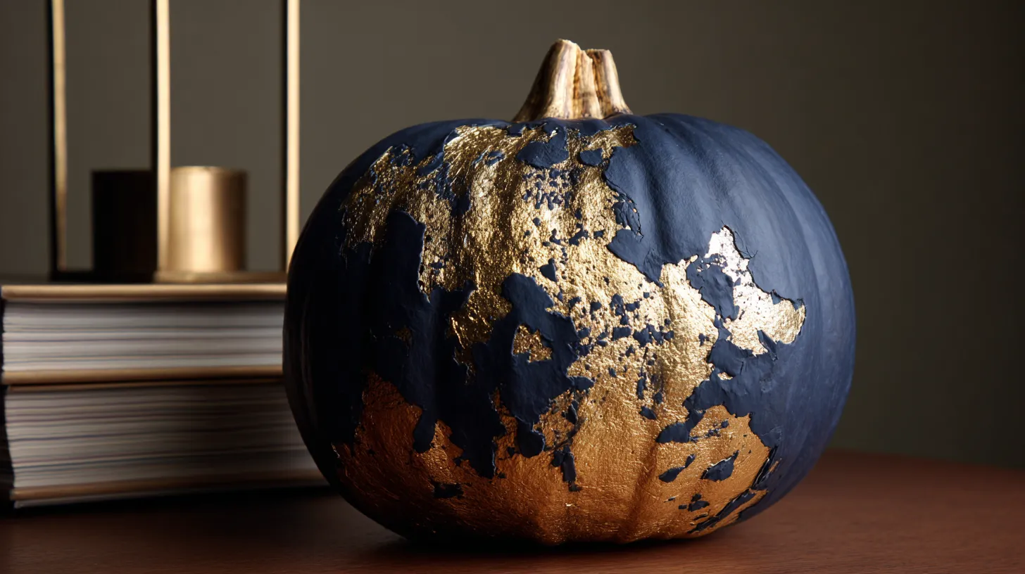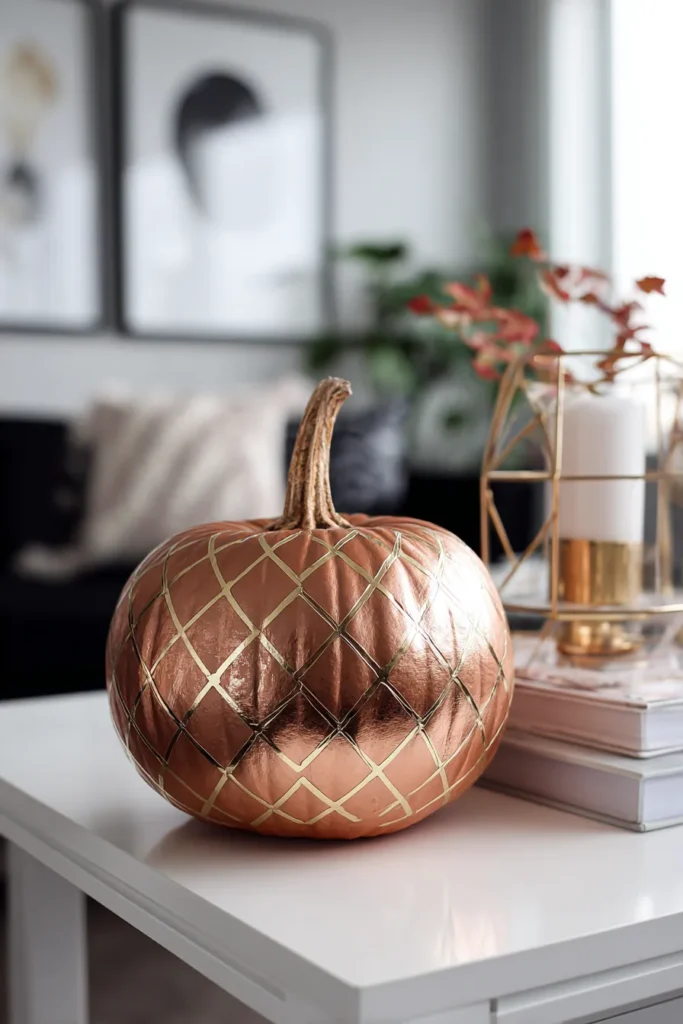 This pumpkin shines with a smooth copper finish accented by a grid of thin golden lines. Placed on a modern white table with sleek decor, it feels polished and contemporary while still warm and inviting.