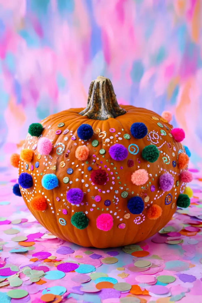 This pumpkin bursts with personality, covered in bright pom poms arranged in fun swirls and dotted patterns. The playful colors pop against the orange pumpkin, with a vibrant backdrop of confetti to match.