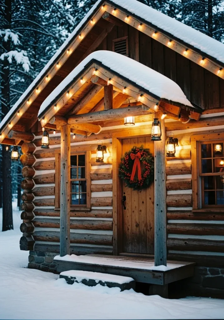This log cabin looks straight out of a Christmas card, with its golden string lights tracing the snow-covered roofline. The rustic wood logs, paired with a simple pine wreath and lanterns by the door, give it that storybook charm that never goes out of style. It’s the kind of home that instantly feels warm and welcoming, even before you step inside.