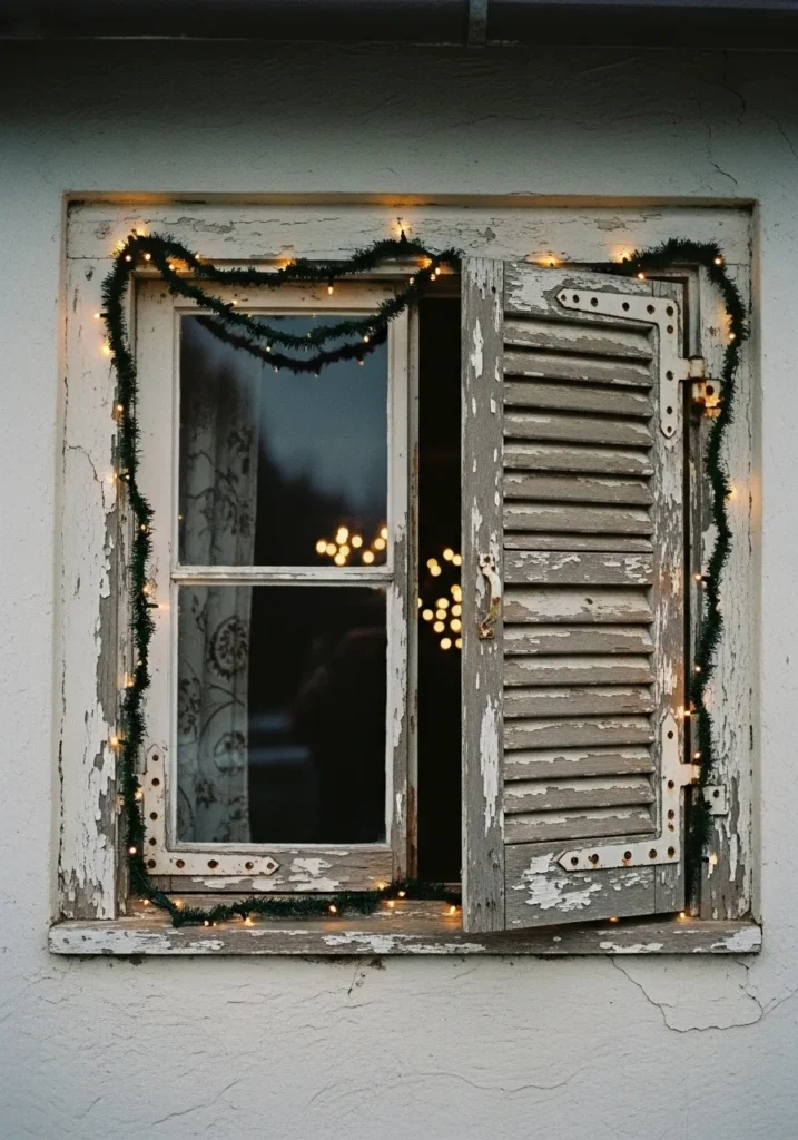This old farmhouse window has all the charm of something time forgot, with its chipped paint, rustic shutters, and garland of twinkling Christmas lights draped gently around the frame. The soft golden glow spilling through the glass feels warm and nostalgic, like a tiny glimpse into someone’s cozy winter evening.