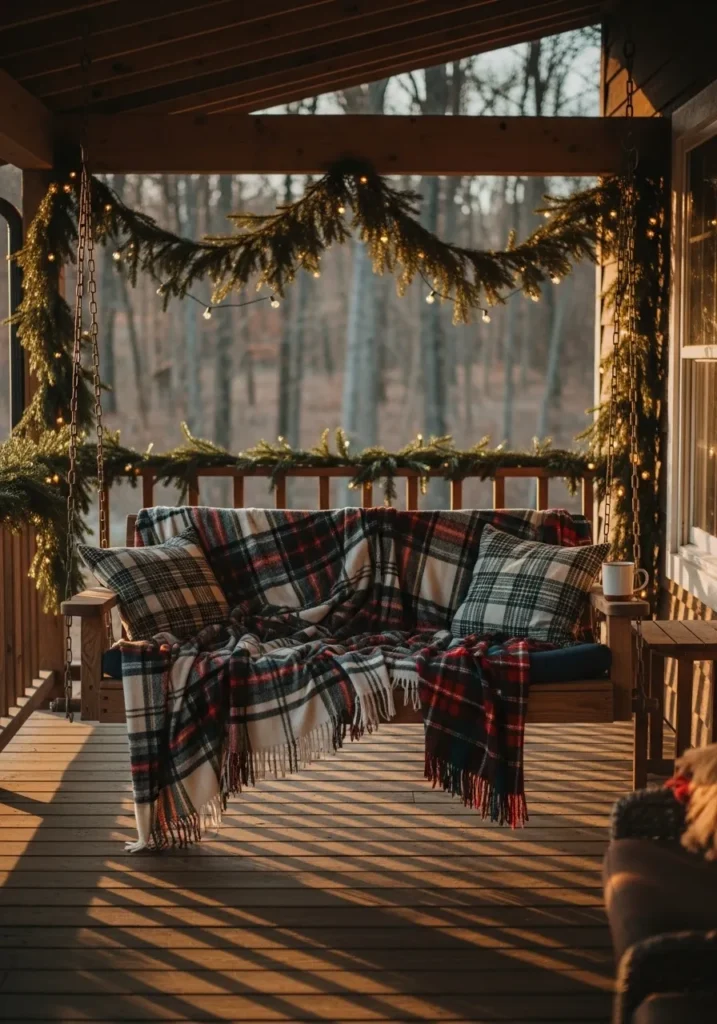 There’s nothing quite like a wooden porch dressed up for the holidays. This one steals the show with lush garlands wrapped around the railings, soft string lights woven through, and a cozy plaid blanket tossed across the swing. It’s the kind of spot that practically begs for a quiet morning coffee while watching snowflakes drift down.