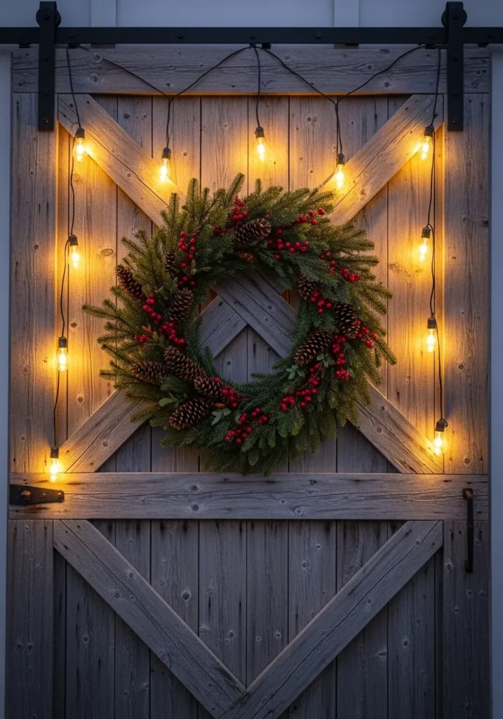 This wooden barn door is dressed up beautifully with a big, full evergreen wreath dotted with pinecones and red berries. The warm glow from vintage string bulbs hanging above adds a soft, festive light that makes the whole scene look cozy and timeless.