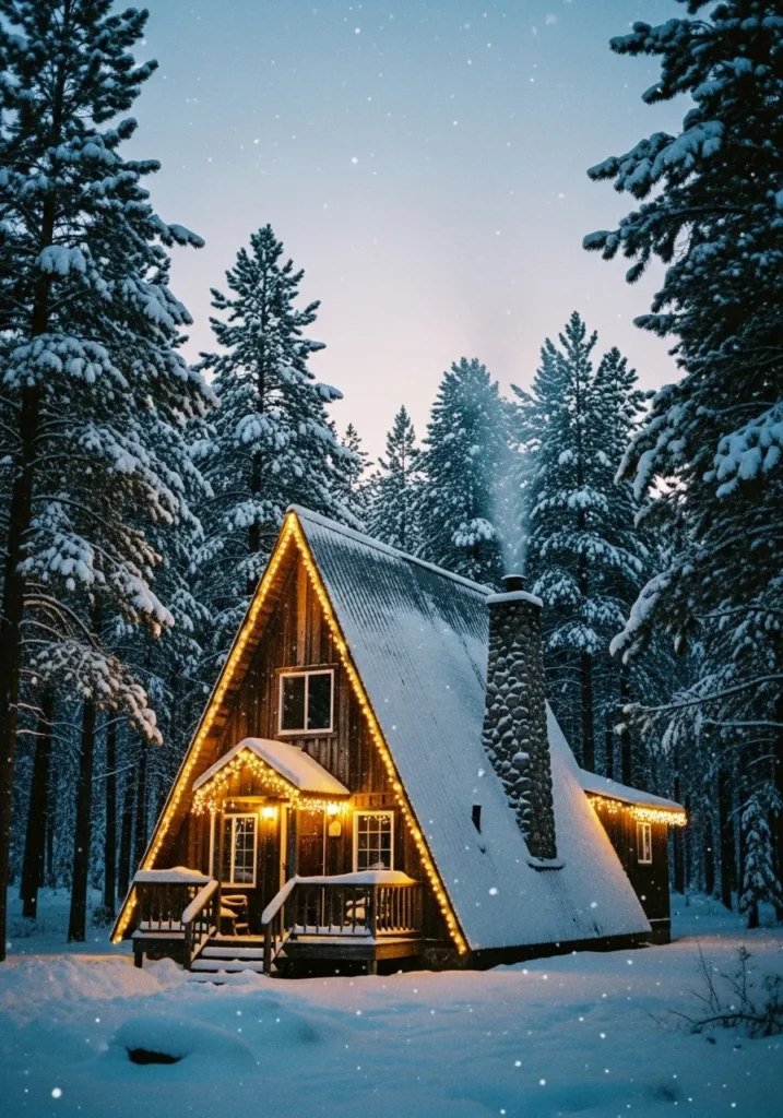 This A-frame cabin tucked in the snowy woods looks straight out of a Christmas movie. Warm golden lights trace the steep roofline, casting a glow that stands out against the deep green trees and soft falling snow. It’s cozy, enchanting, and just the right amount of festive.