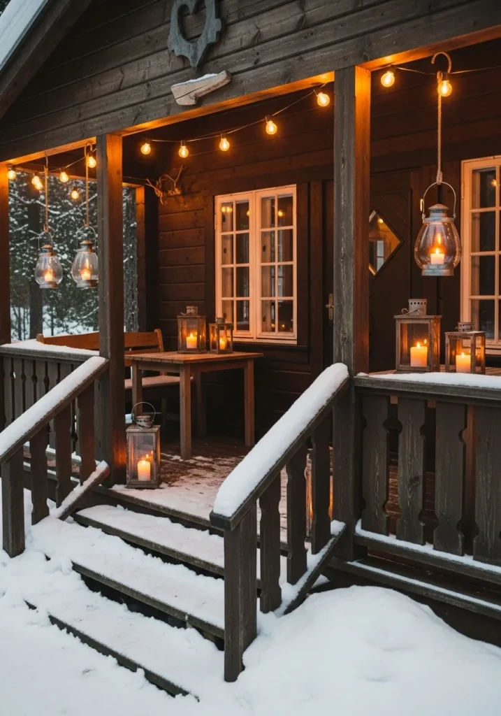 This wooden cabin porch glows with the soft flicker of candles placed inside rustic lanterns. String lights hang overhead, creating a warm golden halo that contrasts beautifully with the snow-covered steps and railing. It’s simple, welcoming, and bursting with country charm.