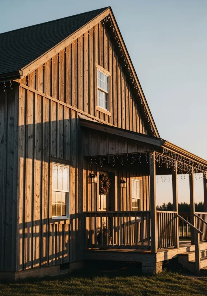 This farmhouse keeps things classic and cozy with wooden siding and a soft row of golden icicle lights hanging along the roofline. The sunlight hitting the wood gives everything a warm, honeyed tone that feels both festive and homey.