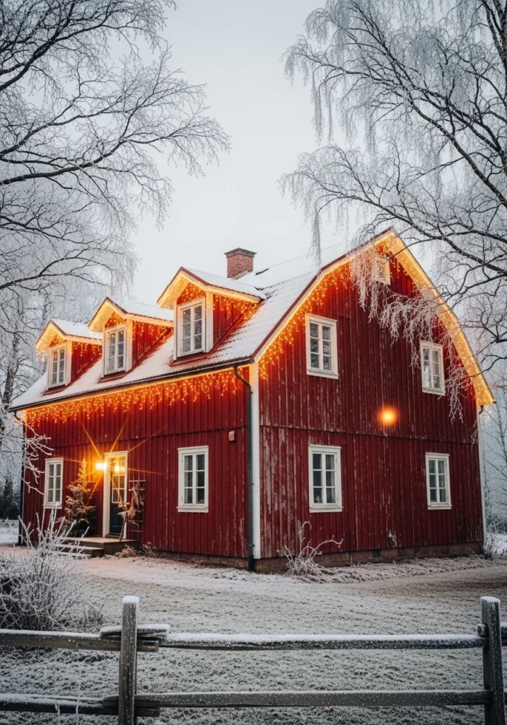 There’s something magical about red houses in the snow. I always think they look like they’re straight out of a Scandinavian winter fairytale. The lights give it that final sparkle, turning simple farmhouse architecture into pure Christmas joy.