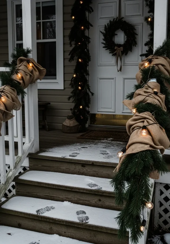This rustic porch setup is such a mood. The soft string lights woven through burlap-wrapped garland bring an earthy, handcrafted look to the entryway. Add a wreath, a few snowy footprints, and you’ve got a picture-perfect welcome that’s simple yet so beautiful.