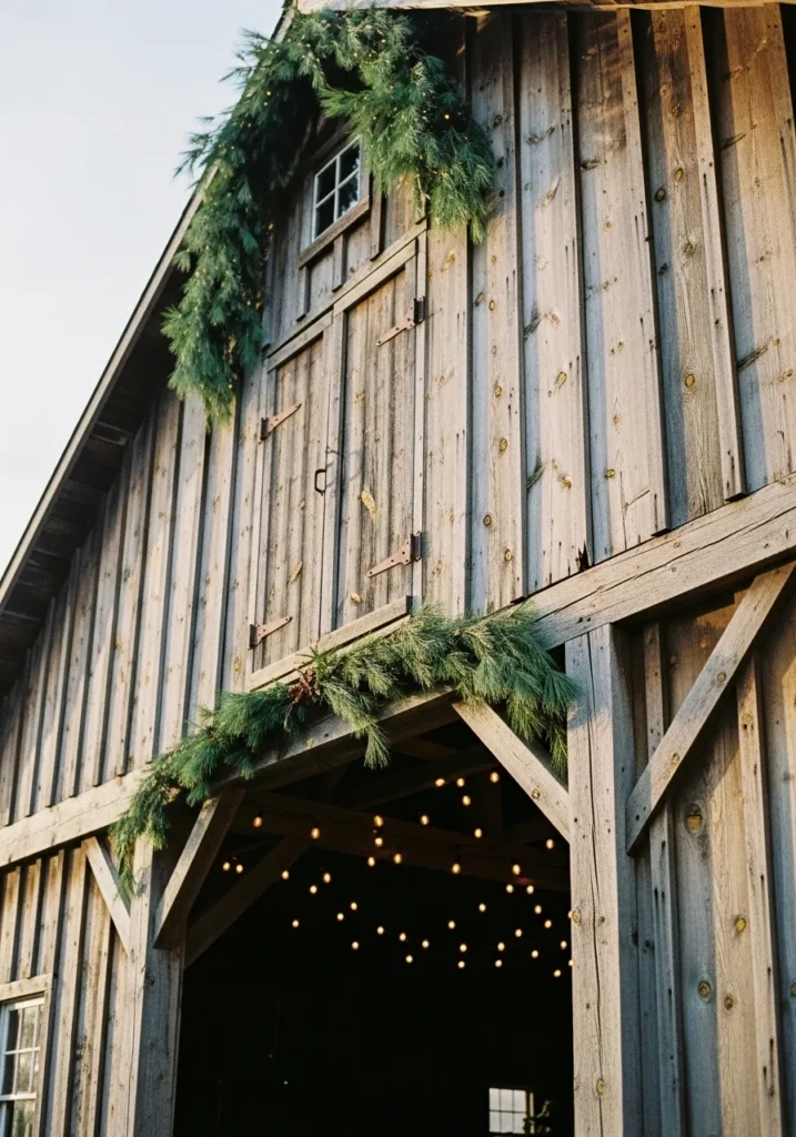 There’s something so timeless about a big wooden barn dressed up with greenery and twinkling lights. The pine garland draped over the entrance adds a touch of nature’s charm, while the soft glow spilling out from inside makes the space feel alive and inviting.