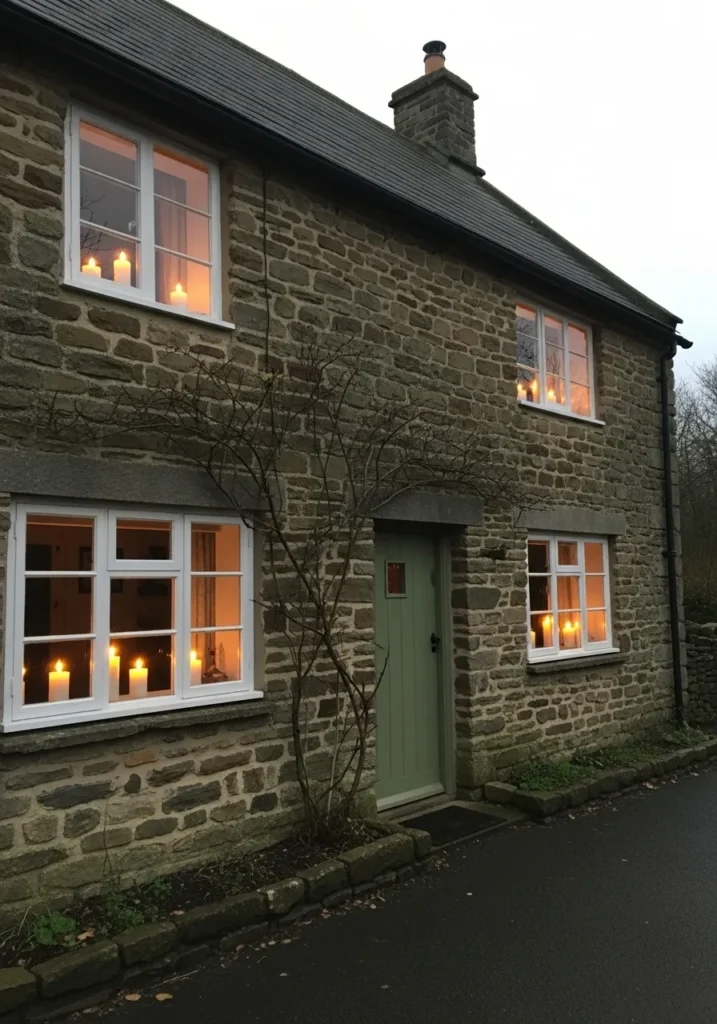 This stone cottage feels like a cozy storybook hideaway. The soft candlelight glowing through the windows creates the most peaceful, old-fashioned Christmas vibe. The green door and simple exterior let the light become the star of the show.