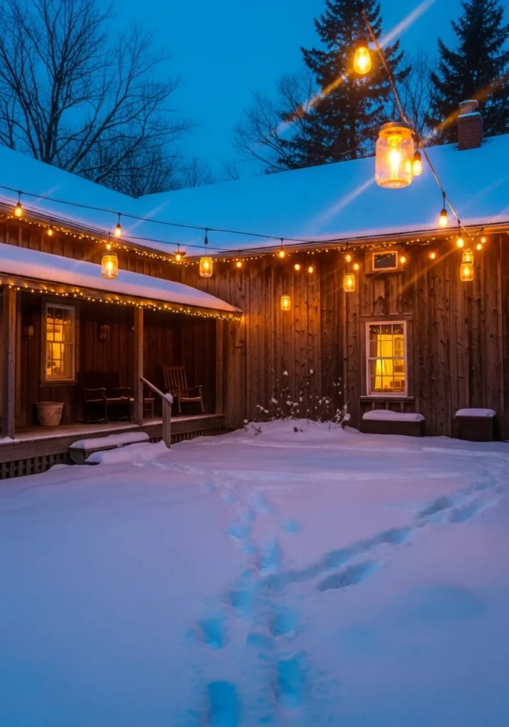 This farmhouse courtyard is absolutely enchanting. Strings of mason jar lights hang gracefully above the snowy ground, casting a soft amber glow over the wooden walls and porch. The snow reflects the light in the sweetest way, turning the space into a cozy Christmas wonderland.