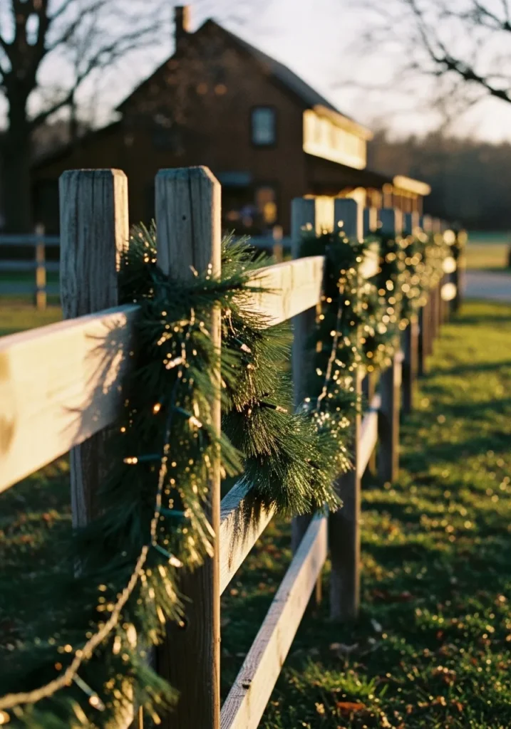 A wooden fence lined with lush pine garland and twinkle lights—could it get more country-perfect? The natural greenery paired with the soft golden glow makes the whole scene feel warm, even in the cool winter air. It’s simple, but it has such a lovely, nostalgic touch.