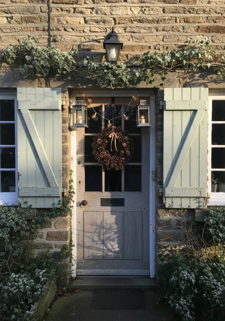 This stone cottage door setup is the definition of rustic elegance. The faded shutters, ivy-draped lintel, and a pinecone wreath tied with a bow feel so authentic and welcoming. The soft lights and lanterns add that magical Christmas sparkle without overpowering the old-world beauty.