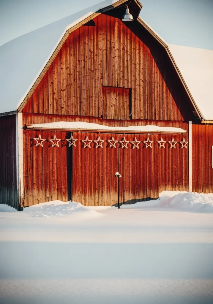 This weathered red barn captures that picture-perfect countryside magic, blanketed in fresh snow with a row of glowing star lights hanging neatly across the doors. The natural wood grain glows warmly in the soft winter light, creating the kind of rustic charm that feels straight out of an old Christmas postcard.