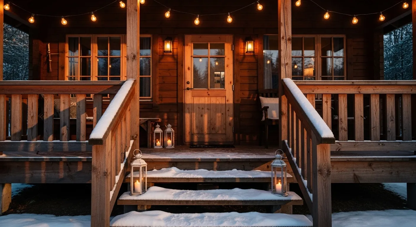 This wooden cabin porch glows with the soft flicker of candles placed inside rustic lanterns. String lights hang overhead, creating a warm golden halo that contrasts beautifully with the snow-covered steps and railing. It’s simple, welcoming, and bursting with country charm.