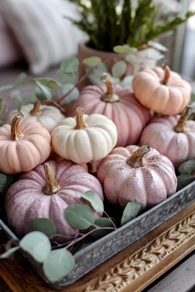 A mix of blush, ivory, and mauve pumpkins are styled together in a rustic tray with eucalyptus leaves. The variety of shades gives it a collected, organic look that feels perfectly seasonal.