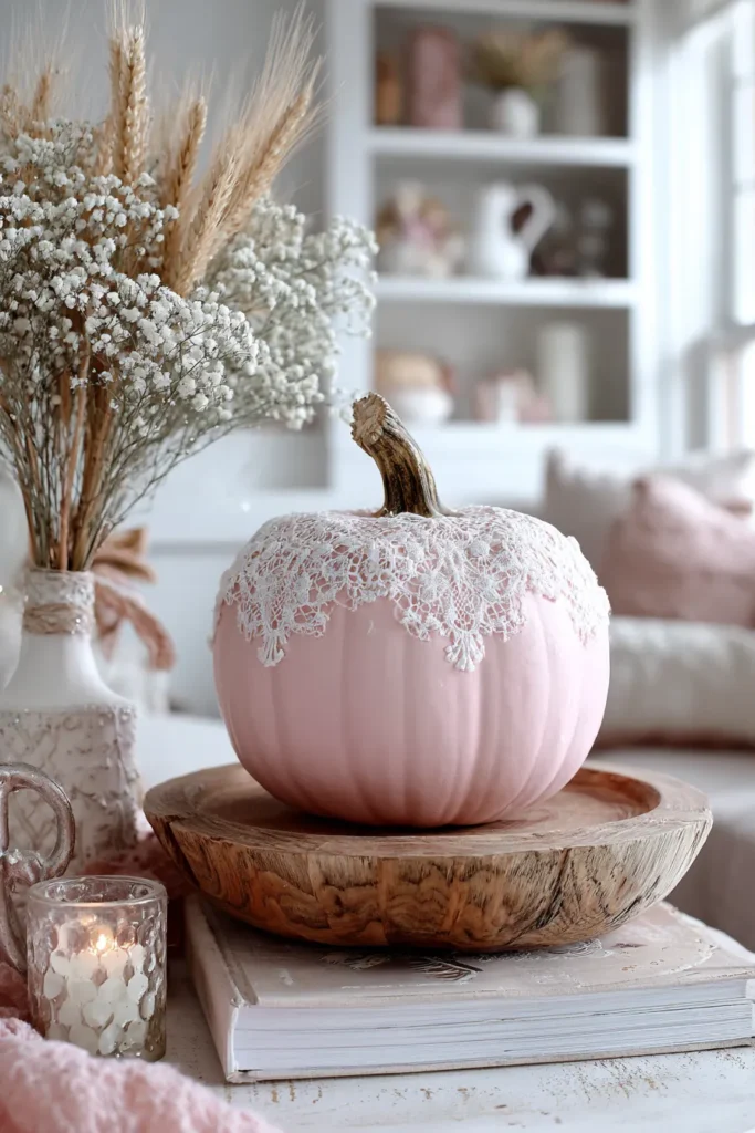 Here a pale pink pumpkin is crowned with a delicate layer of lace, almost like it is wearing its very own bridal veil. Styled on a wooden tray with soft florals and neutral accents, it brings an air of vintage charm to any corner of the home. The lace detail adds texture and interest while keeping the look sweet and feminine.