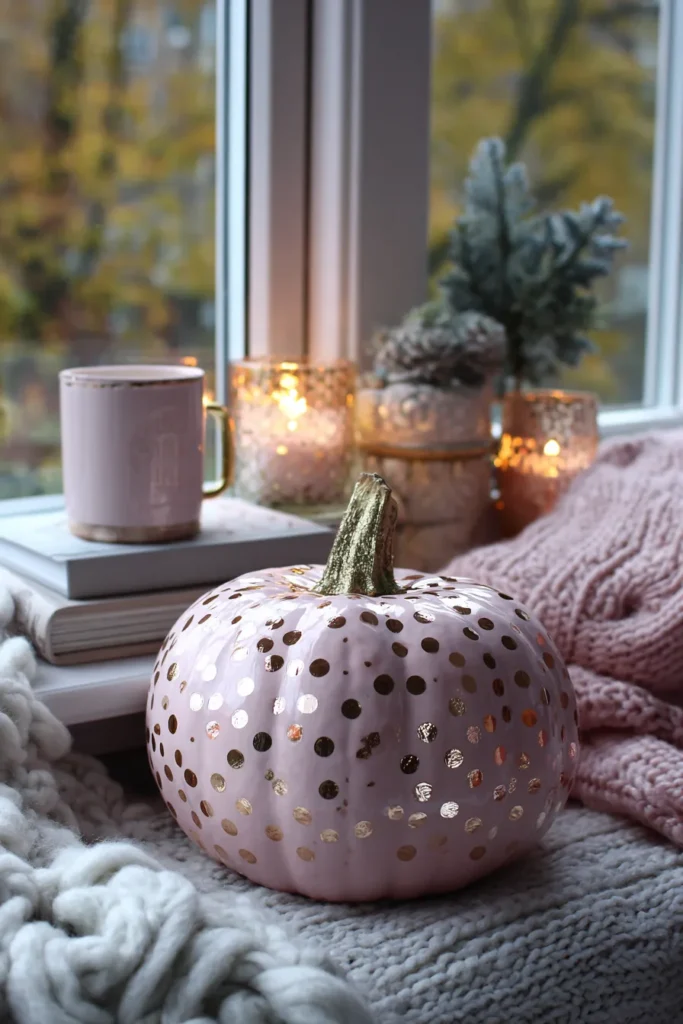 This playful pumpkin is painted in a soft blush tone and decorated with shiny gold polka dots scattered across the surface. Paired with cozy blankets and flickering candles by the window, it feels warm and stylish all at once. The golden spots catch the light beautifully and add a little sparkle to a quiet fall evening.