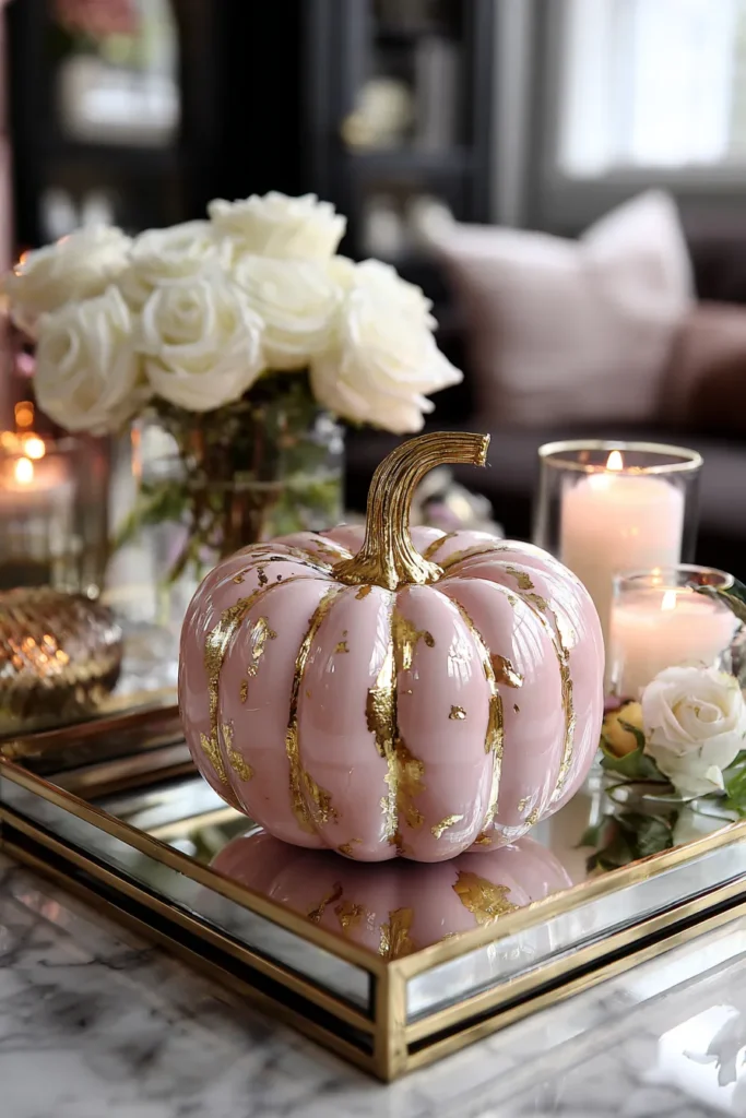 This pumpkin is dressed in soft blush pink with shimmering gold leaf accents that catch the candlelight. Sitting on a mirrored tray with glowing candles and fresh white roses, it feels like a little jewel box moment right on the coffee table.