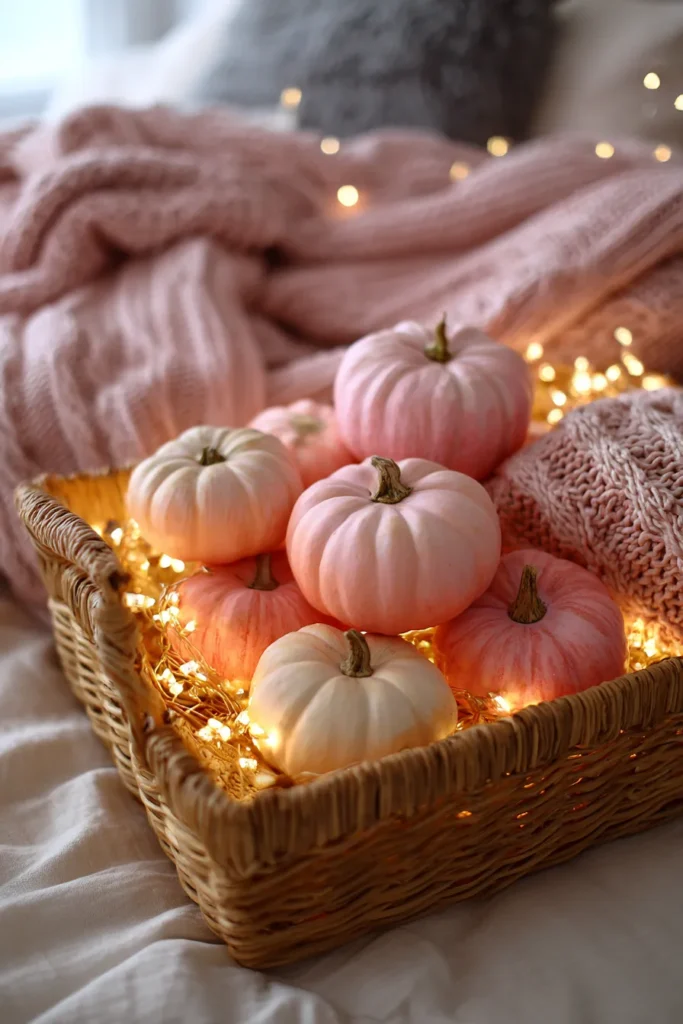 A woven basket brimming with pale pink and ivory pumpkins becomes even more magical with tiny fairy lights woven through. Toss in a chunky knit blanket, and the whole scene looks like it belongs in the coziest fall daydream.