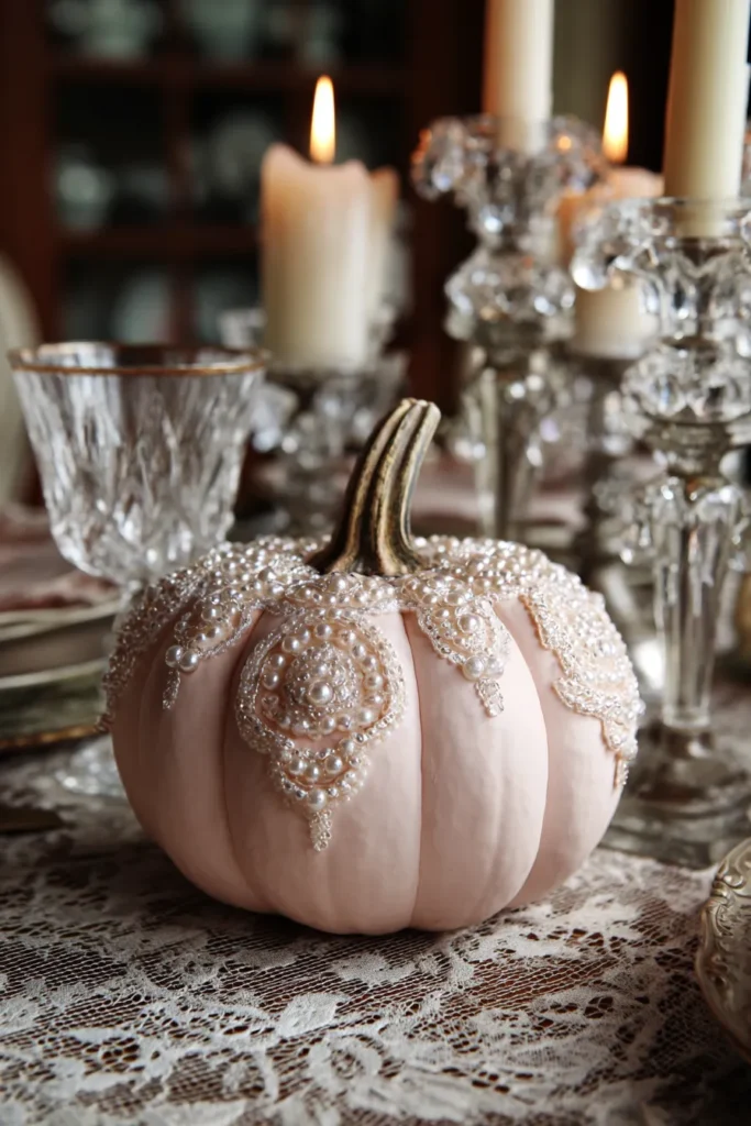 This blush pumpkin is adorned with pearl embellishments that look like intricate lacework. Surrounded by crystal candlesticks and vintage glassware, it has an unmistakable romantic charm.