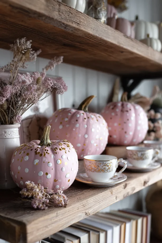 These pink pumpkins are painted with cheerful white and gold polka dots and styled on rustic wooden shelves. Surrounded by dainty teacups and dried flowers, they bring a fun yet feminine vibe to the space.