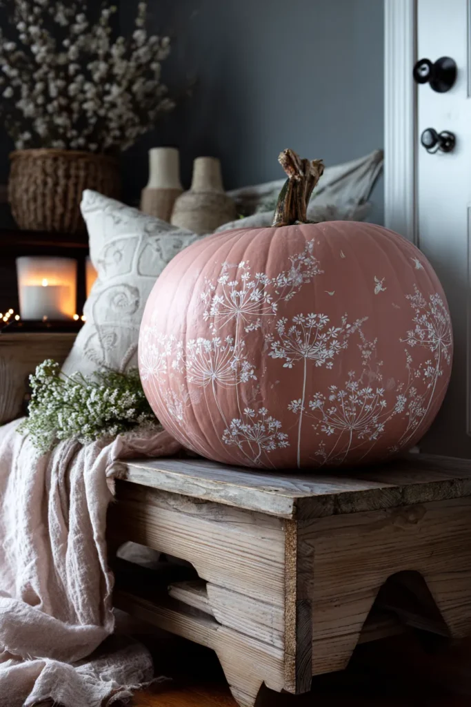 A large pumpkin in a muted blush shade is decorated with white floral patterns that look hand-painted. Placed on a rustic wooden bench with cozy pillows and blankets, it’s both artistic and comforting.