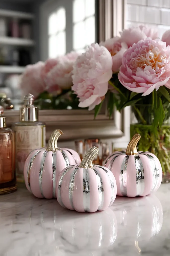 These pumpkins are glossy pink with striking silver stripes, paired with soft peonies and perfume bottles on a marble vanity. The metallic shine makes them look modern and chic.
