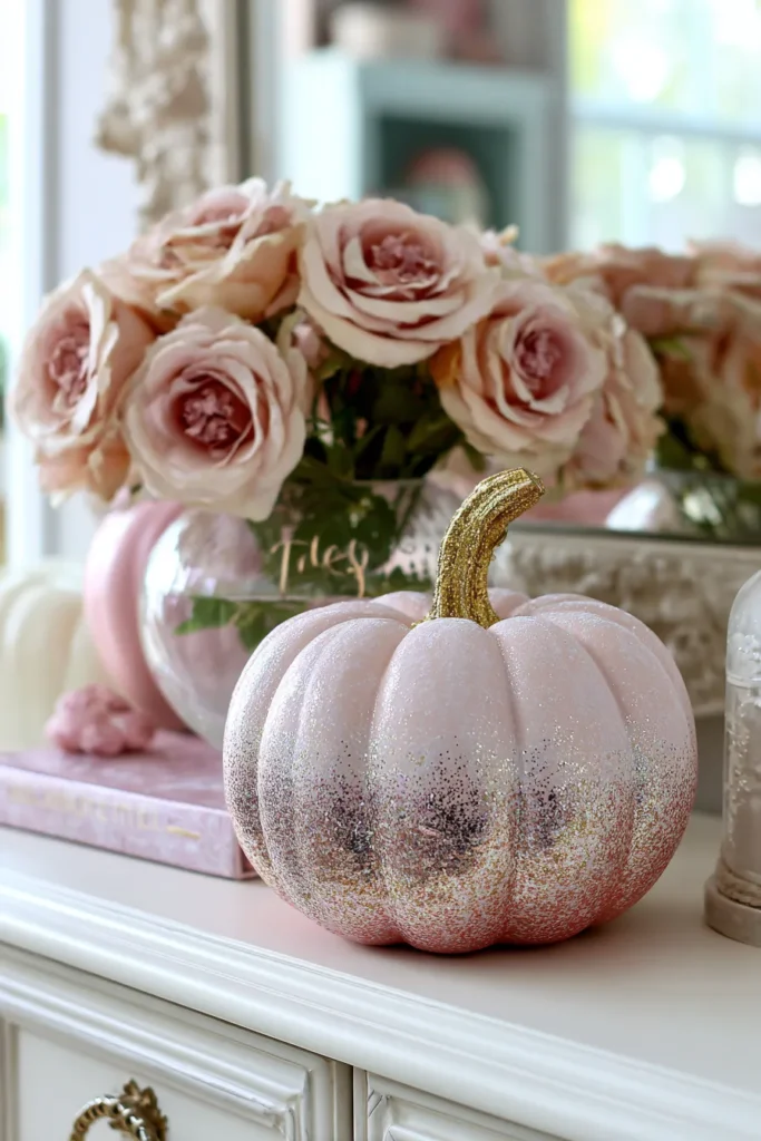 This pumpkin sparkles with glitter fading from soft pink to shimmering gold. Styled next to romantic roses, it feels feminine and a little whimsical.