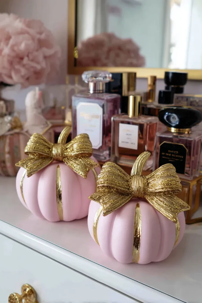 Two pale pink pumpkins are topped with oversized golden bows, making them look like tiny presents. Placed next to perfume bottles and blush peonies, they’re sweet and glamorous all at once.