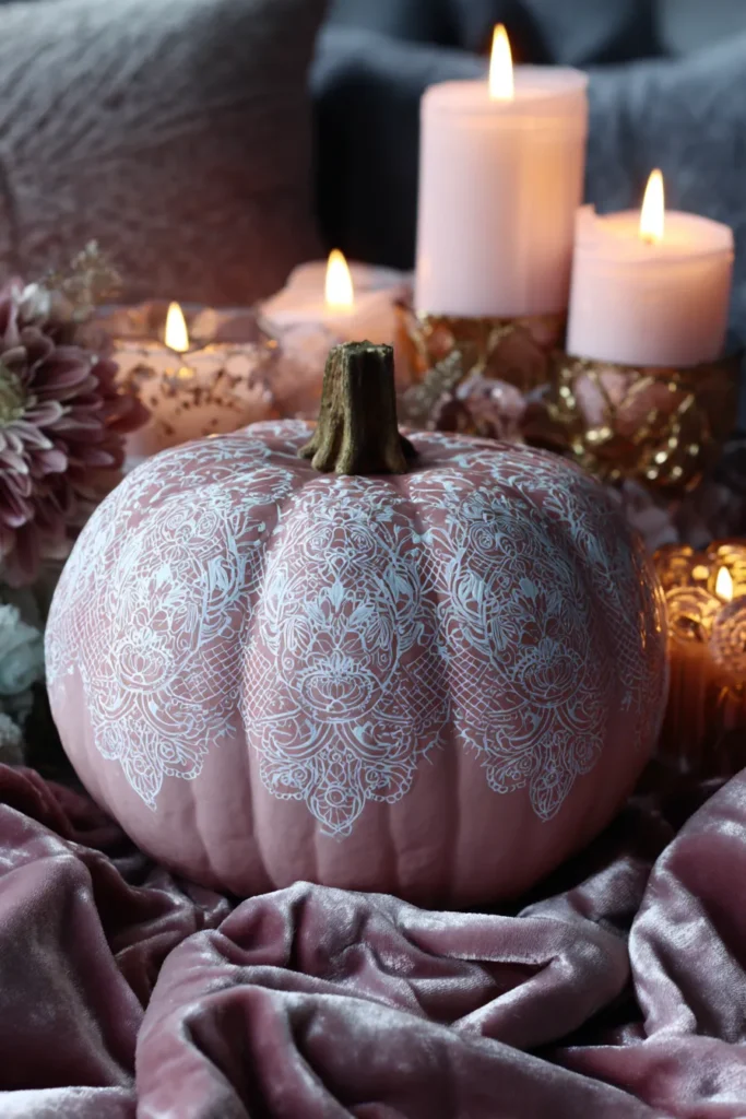 This pumpkin has been hand-painted with an intricate lace-style design in white, glowing beautifully in the candlelight. Surrounded by pink candles and soft textures, it creates a romantic mood.