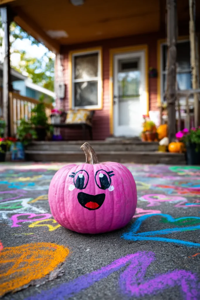 Painted bright pink with a cartoon-style happy face, this pumpkin looks like it stepped out of an animated show. It has big wide eyes, long lashes, and a cheerful grin that makes it irresistible.