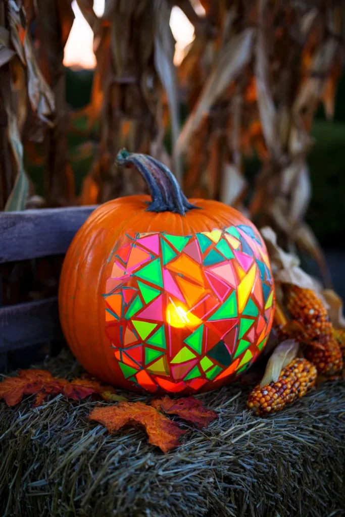 This pumpkin looks like a glowing piece of neon art, with bright green, orange, pink, and yellow triangles pieced together in a geometric pattern. When lit up, it feels like stained glass but with a playful, kid-friendly twist.