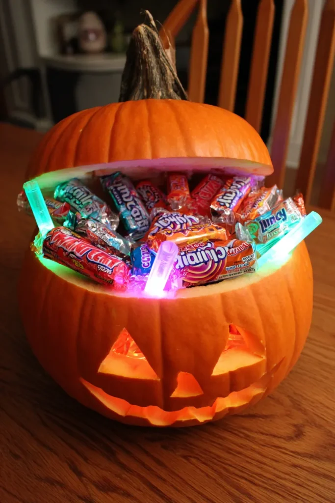 Instead of just decoration, this pumpkin doubles as a candy bowl. Carved with a wide mouth, it’s filled with wrapped sweets and even glows with neon sticks for extra fun.