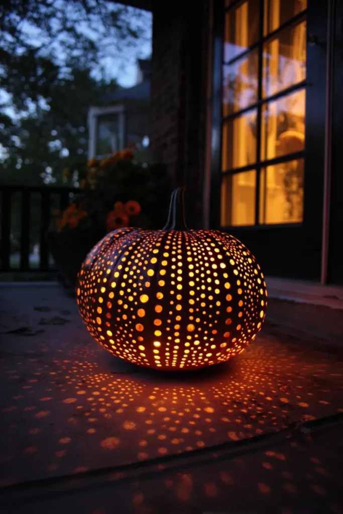 Dozens of tiny holes are drilled across this pumpkin, creating a glowing constellation when lit up. The light spills across the porch in dotted patterns that sparkle like stars.
