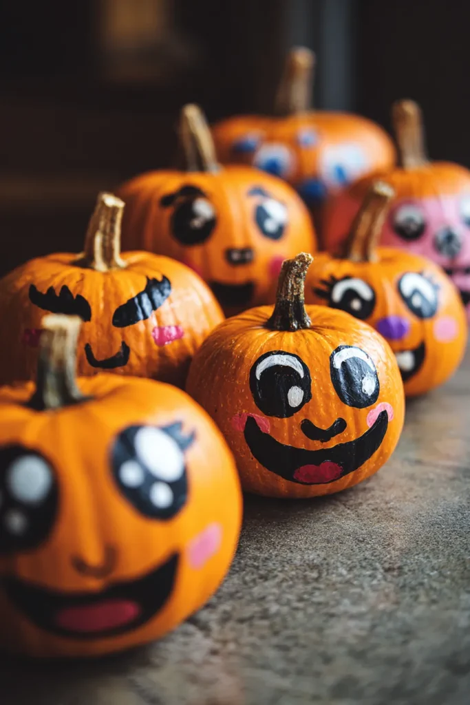 These pumpkins are painted with oversized eyes, rosy cheeks, and big silly grins. Each one has its own personality, turning a group of pumpkins into a cheerful little gang.