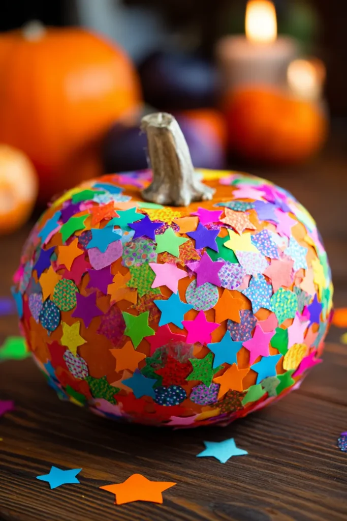 Covered from top to bottom in colorful confetti stars, this pumpkin looks like it’s ready for a party. The bold, bright shapes make it pop, even without a candle inside.