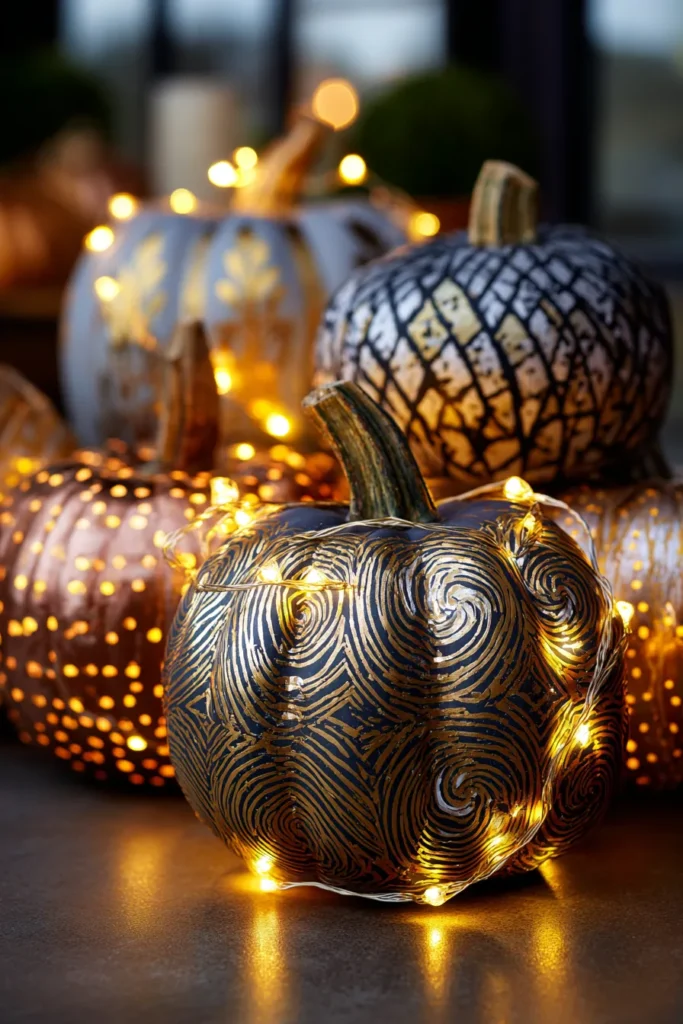 These pumpkins shine with metallic paints, intricate patterns, and glowing fairy lights wrapped around them. The combination of gold, bronze, and black gives them an elegant sparkle.