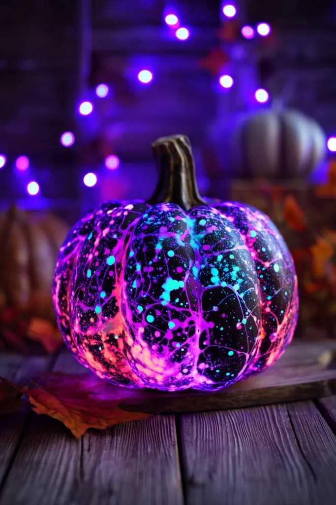 Painted black and splattered with neon colors, this pumpkin lights up like an abstract masterpiece. The glowing paint makes it look like it belongs at a glow party.