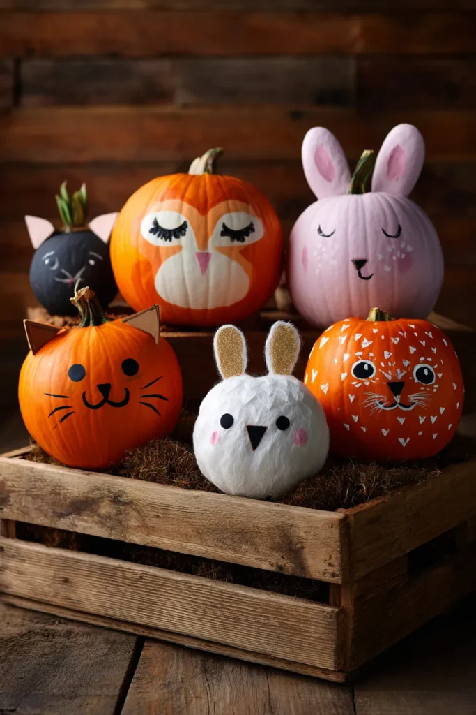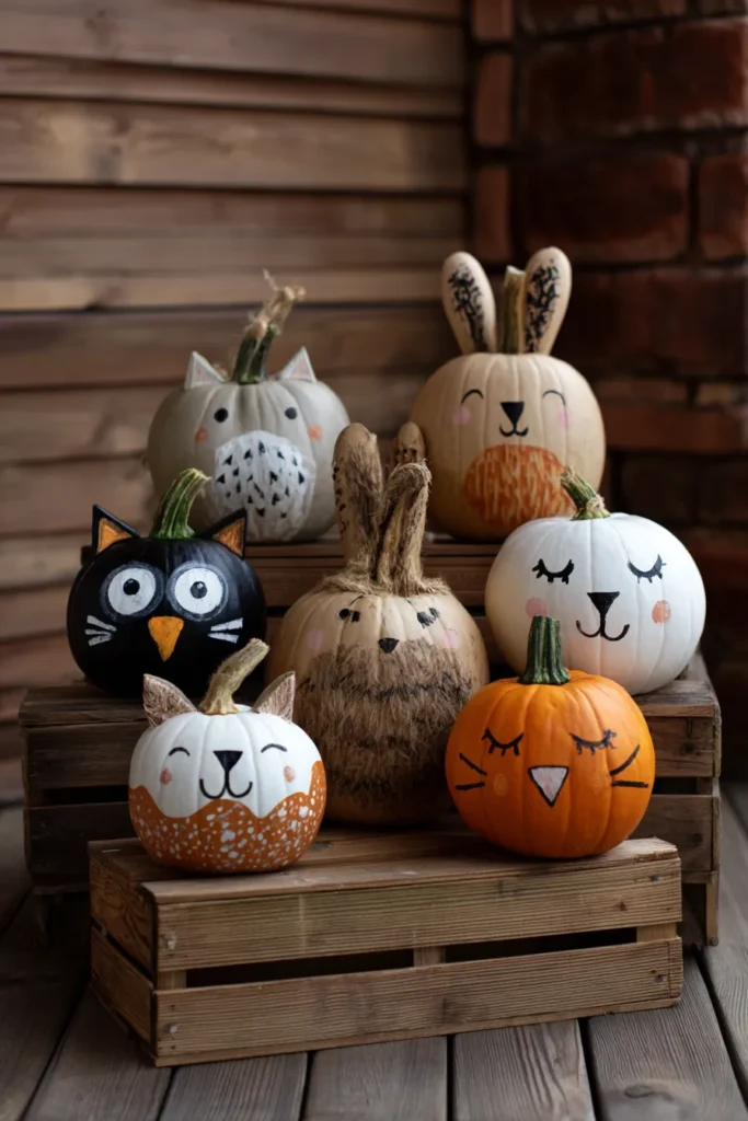 This group of pumpkins is painted to look like woodland animals, from cats and owls to bunnies with big ears. Each one is sweet, friendly, and full of personality.