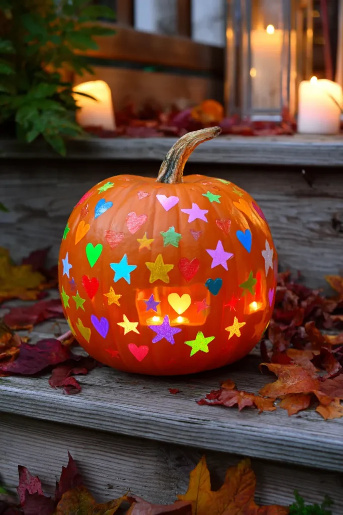 Covered in colorful star and heart cutouts, this pumpkin glows with rainbow magic. The mix of vibrant stickers and simple cut shapes creates a cheerful design that shines beautifully on a porch.