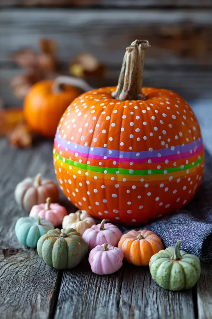 This pumpkin keeps it cheerful with painted polka dots and bold rainbow stripes wrapping around the middle. It feels playful and modern, almost like a candy-striped pumpkin straight out of a children’s storybook.