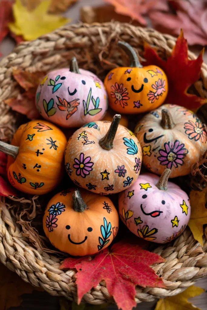 These little pumpkins are painted with happy faces, flowers, and doodles in bright colors. Nestled together in a basket, they look like a group of cheerful friends ready for Halloween fun.