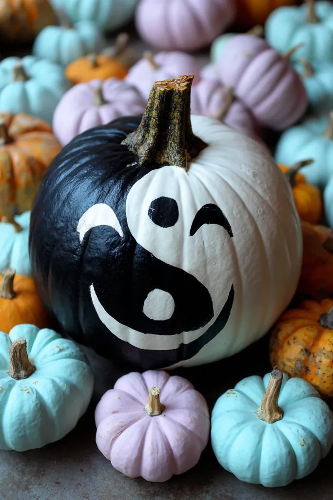 Half painted black and half white, this pumpkin shows off a playful yin yang face that’s winking back at you. Surrounded by pastel mini pumpkins, it brings a cool modern vibe to Halloween décor.