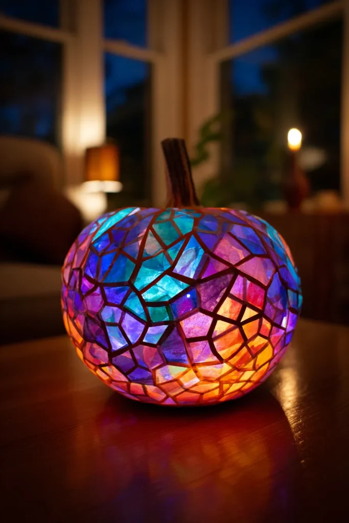 This pumpkin is glowing like a stained glass lamp, with colorful mosaic pieces lit from within. The light bounces through in rich blues, purples, and oranges, giving it a magical, cozy effect.
